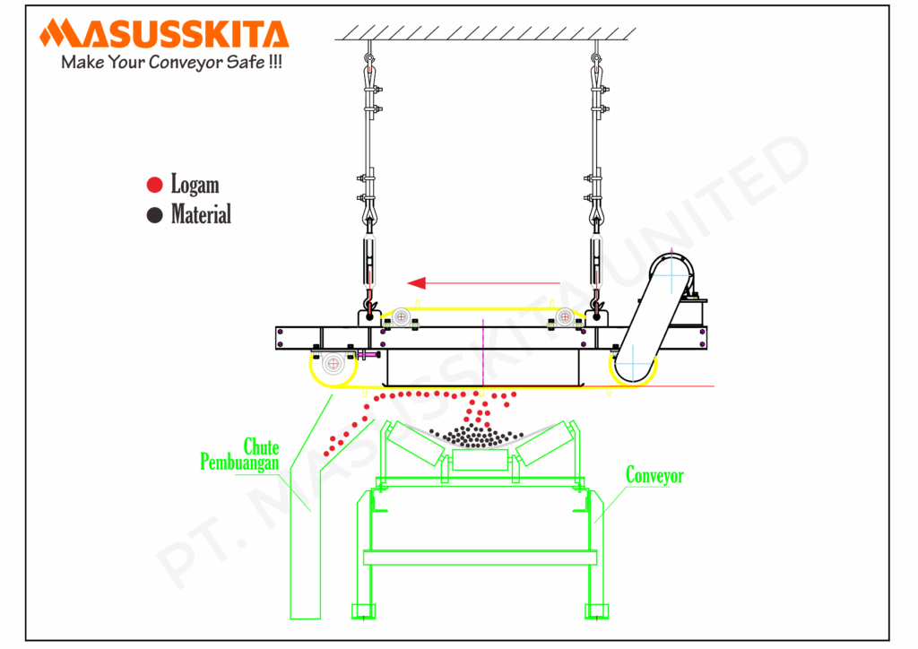 - Overband Magnetic Separator: Digunakan dalam conveyor belt untuk memisahkan logam dari material non-magnetik.